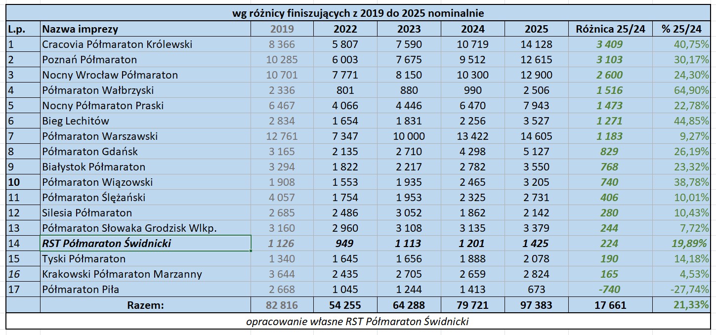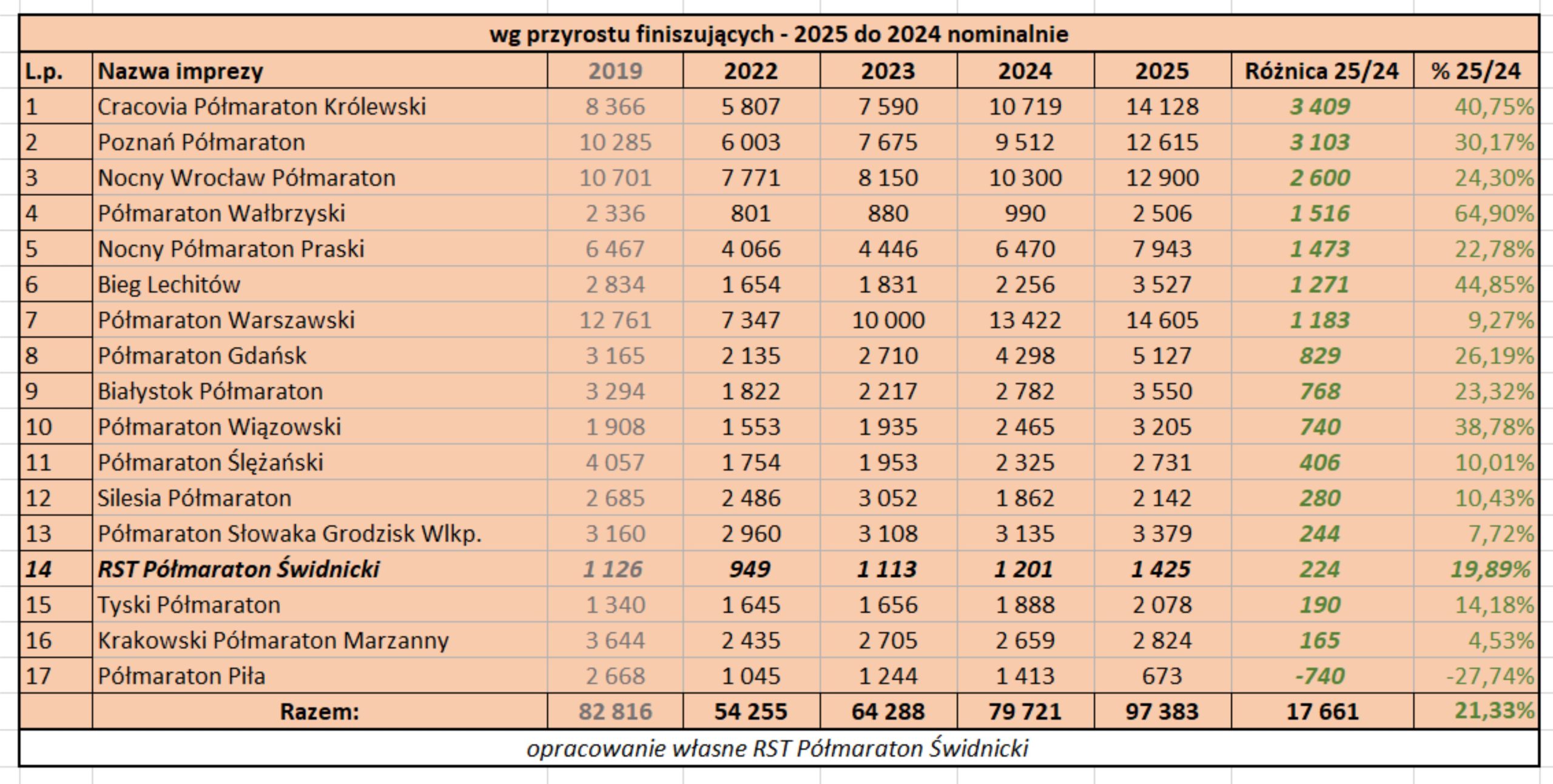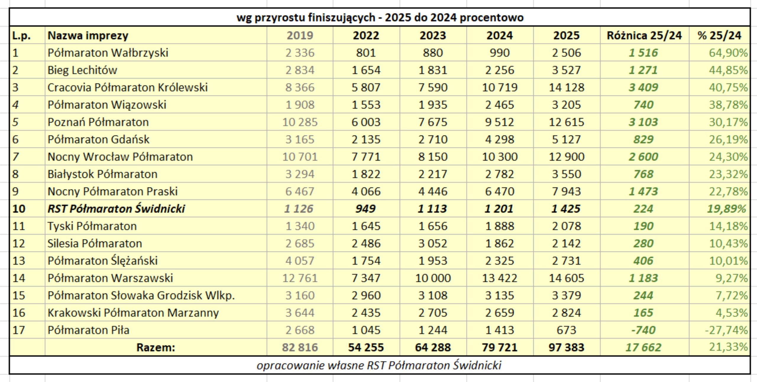 Przedstawiamy opracowanie własne dotyczące wybranych półmaratonów w Polsce. Nie jest to żaden oficjalny materiał, ale pozwala na kilka wniosków. Niech one będą wyciągnięte przez Was samodzielnie.